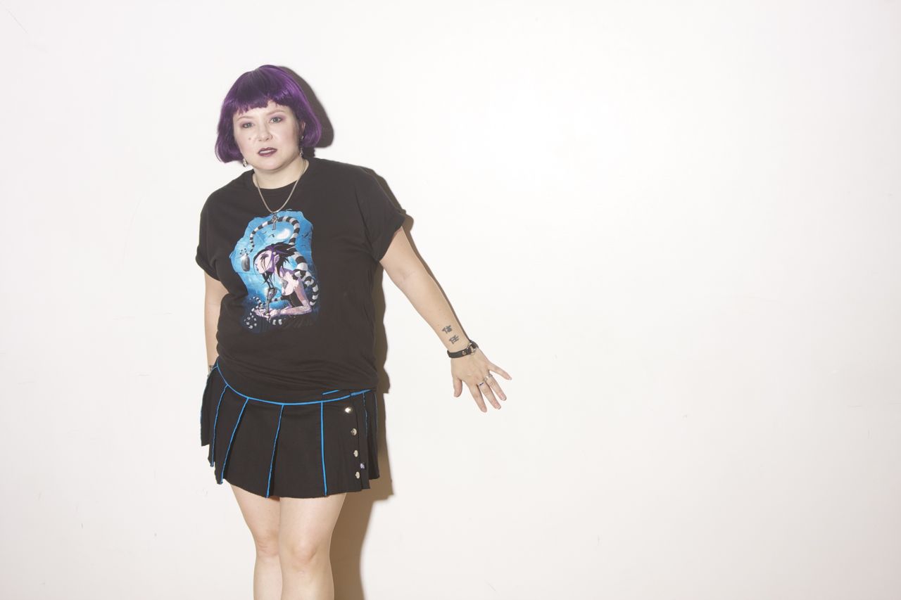 And yes, those are fuzzy cuffs attached to her waist cincher. [Clomplete outfit compliments of "Vampire Freaks" here in NYC]